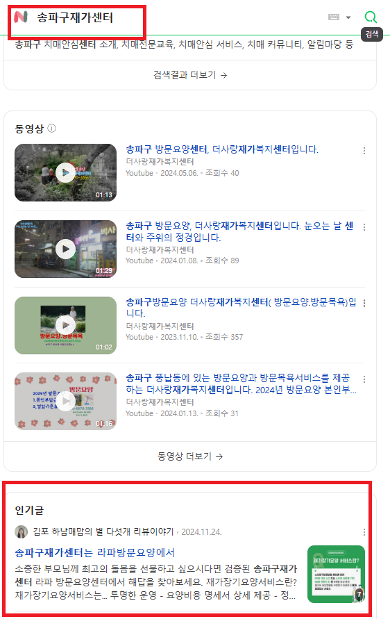 2) “송파구 재가센터” 검색 시 최상단 노출